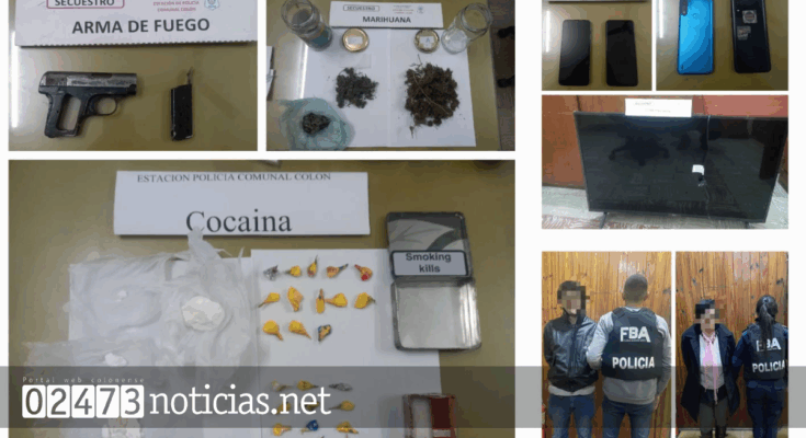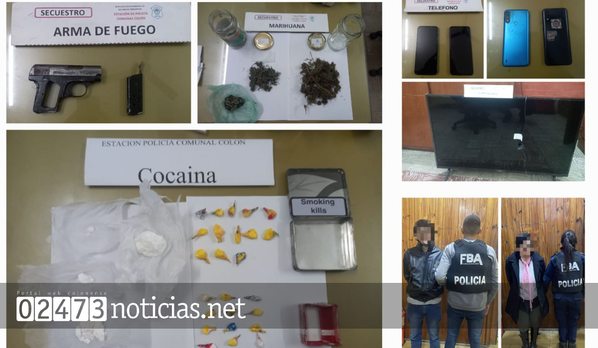 Durante el procedimiento, personal del Gabinete Técnico Operativo de la EPC Colón, con colaboración del CRP local, logró recuperar un televisor LG de 43 pulgadas que había sido denunciado como sustraído en el robo efectuado el pasado 1 de junio. Además, se incautaron 22 gramos de marihuana, 27 bagullos de cocaína fraccionada para la venta, otros 38 gramos sin fraccionar, una pistola calibre 22 mm marca Browning, dos teléfonos celulares, elementos de corte (balanzas y tijeras), 100 dólares estadounidenses y más de 1.847.000 pesos en efectivo.